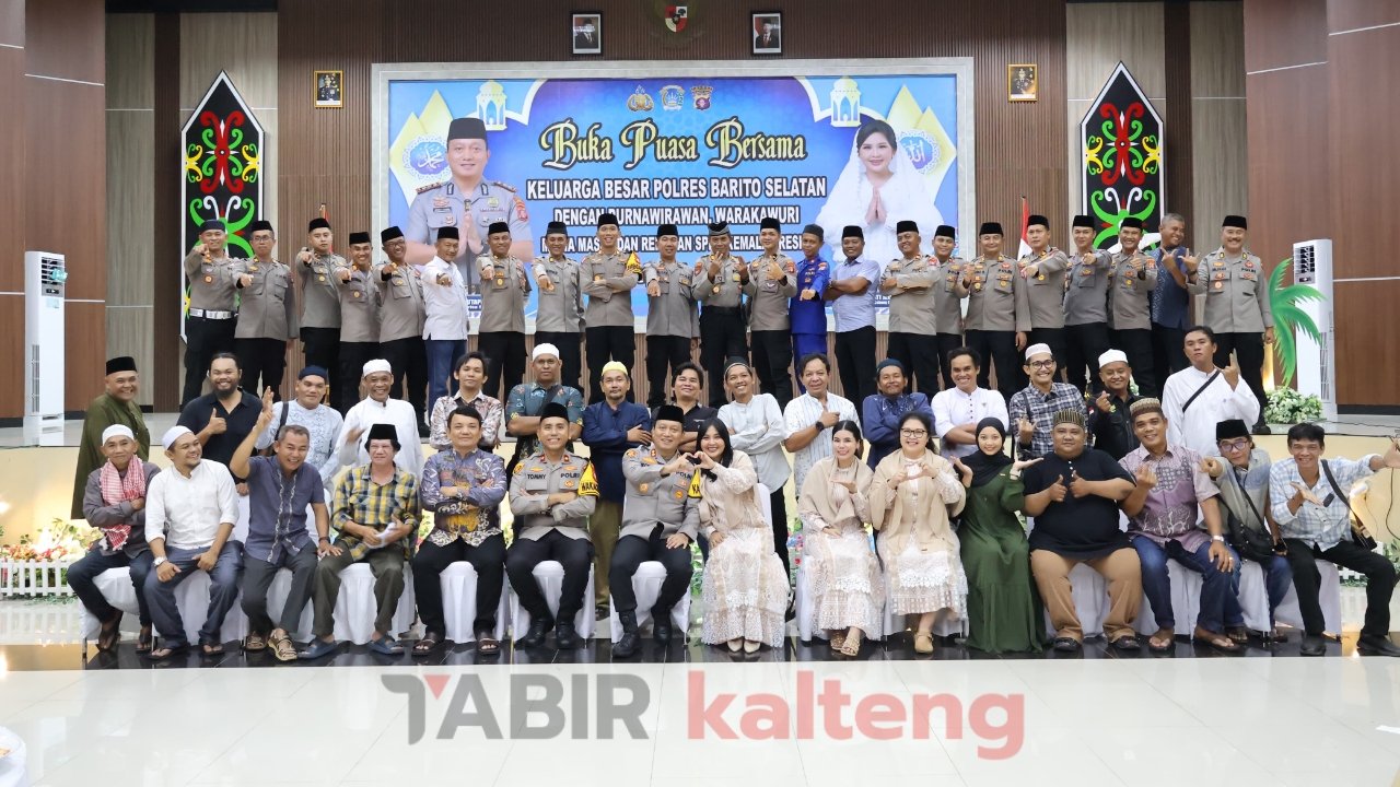 BUNTOK – Keluarga besar Kepolisian Resor (Polres) Barito Selatan (Barsel), Kalimantan Tengah (Kalteng), menggelar kegiatan buka puasa bersama yang diikuti wartawan, purnawirawan, warakawuri serta relawan SPPG Kemala Presisi di Aula Tantya Sudhirajati Polres setempat, Sabtu (15/3).